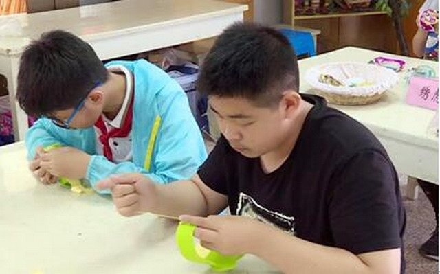 当记者来到高年级制作区域时,有些惊呆了。一群小“绣娘”中,竟然还有两位男生。最不可思议的要数人称“包边小王子”的湛乐康同学了,别看他身形圆圆胖胖的,手里的动作却是非常的娴熟呢。