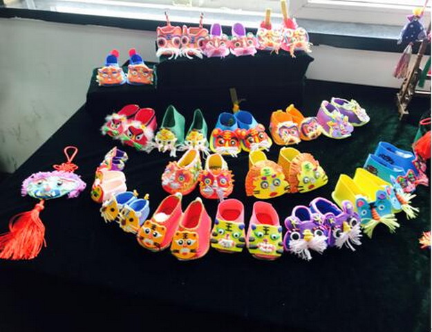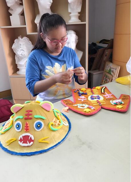 现如今,虎头鞋已经成为平直实验小学艺术展示专场的主题之一。每逢周一下午的兴趣课,我校美术教室中总有一群孩子在制作着。剪鞋形、做虎头、贴装饰,宋佳希老师手把手的教中低年级学生选择用色彩亮丽粘土结合综合材料来创新虎鞋;绱鞋底、饰虎身、纳鞋底、包边、绣虎面,我校任教高年级美术学科的张宁老师亲切指导学生穿针引线学习用传统刺绣手艺方法制作非遗款式的虎头鞋,同学们各忙各的,分工明确。