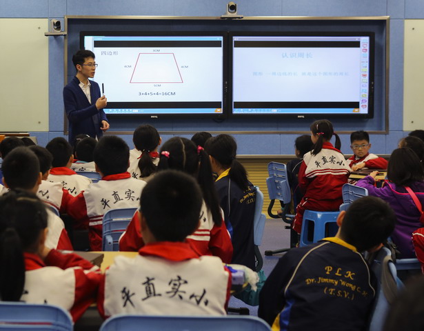 傅荀皓老师的数学课,《认识周长》,在未来教室中,最大程度地运用了多媒体的直观作用,让内容变得浅显易懂,深受孩子们的喜爱。香港的小朋友积极举手,和傅老师亲密互动,笑容洋溢在他们的脸上。