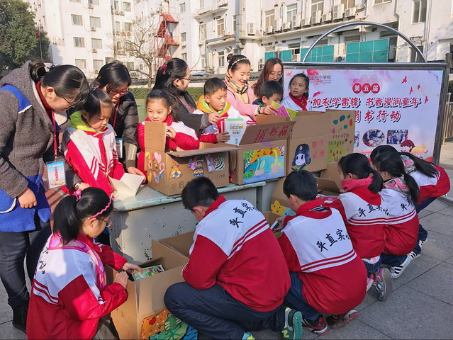 瞧啊,每一个班级都获得了一个大大的纸箱,心灵手巧的孩子们用自己的彩笔把纸箱装饰得多么美丽啊!有的班级,画上了栩栩如生的读书图;有的班级,写上了一句句关于读书的名言警句;有的班级,贴上了一张张精致典雅的爱心书签;有的班级,写上了同学们对远方伙伴的一句句亲切的问候……里面的书籍是礼物,外面的纸箱,也是别具一格的爱心礼物呢!