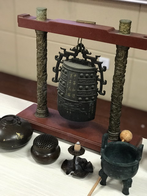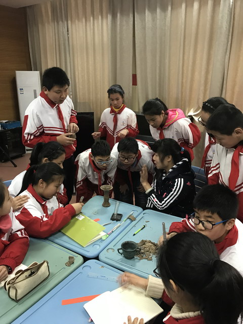 顾老师端起了桌上正中间最大的铜器,说道:“老师今天带来的大多都是古人青铜用具的缩小件,这些用具,有的是酒具,有的用于烹饪食物,而我手上的这个,则是附带编钟的缩小件,可以演奏美妙的乐曲,也可以用于传递消息。”说着,顾老师拿起一根小木槌,轻轻敲起来,“叮,叮,叮……”编钟清脆的声响一下子萦绕在教室里。放下编钟,顾老师又端起了那个顶端有朵火焰的铜器:“这是古人用的油灯,看,这个装油用的小盖子还可以翻下来,盖子下还有一只小羊呢!”……我们惊异于这些铜器的精巧,更折服于古人的匠心与巧做。