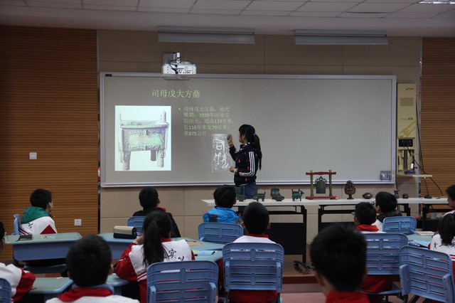 随着教室两旁的窗帘悄然拉拢,伴着顾老师清新生动的讲解,若有若无的清香带着我们一起穿越到了古老的青铜器时代。顾老师不仅讲解了青铜器的由来,还讲起了与青铜器相关的故事“卧薪尝胆”和“鱼肠剑”……娓娓道来的故事令我们沉醉于有趣的青铜历史中。