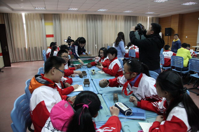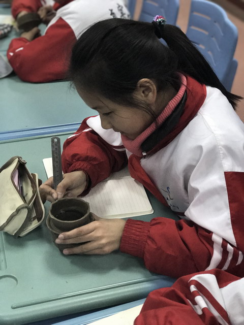 讲座中最有趣的还是动手环节。当一个个蜡制的青铜器模型摆放在大家面前时,我们不禁雀跃起来。这些模型还只是雏形,有不少多余的部分需要我们用铁尺刮掉。别以为这是一件简单的事情。这些蜡制的模型十分脆弱,力度掌握不好,可是会受伤的。尽管我十二万分的小心,稍一用力,手中蜡模的手柄就折断了。沮丧的我赶紧求助于顾老师,她却一点儿也不着急。只见顾老师拿起一把冒烟的工具枪对着断下的部分一烫,往杯身上轻轻一靠,那模型立刻就复原如初了!青铜器的制造过程可真是神奇呀!渐渐地,我们从一开始的毛手毛脚中,找到了窍门变得利索起来。看着手下越来越有模样的蜡模,我乐在其中,甚至觉得自己有了几分大师风范。