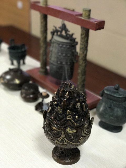 走进教室,幽香袅袅,沁入心脾,只见桌上摆放着两排青铜器。它们形态各异,做工精巧。正中间的那个,呈长方形,挂再红色的木制架子上,古朴沉静,它是最大的一个,因此格外引人注目。而一旁的一尊青铜器,顶端有一朵小小的火苗闪烁跳跃,我不禁想:那香味会不会就是从它那儿飘来的呢?