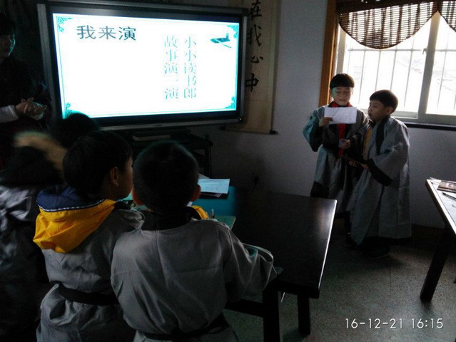 第二节课上老师让同学们找伙伴两两结伴表演两个经典的故事:《铁杵磨成针》和《孔融让梨》,孩子们兴致很高,都迅速找到自己的表演搭档排练起来并踊跃举手上台表演!刚开始有的同学没掌握表演要领,座位上的同学纷纷举手提出整改方案,果然在大家的帮助下,接下来上台的同学们越演越好,声音大起来了,并且加了动作!直到下课钟声敲响孩子们还沉浸在表演的乐趣中!老师看大家这么积极,把稿子发给同学们让有兴趣的回家再练习!