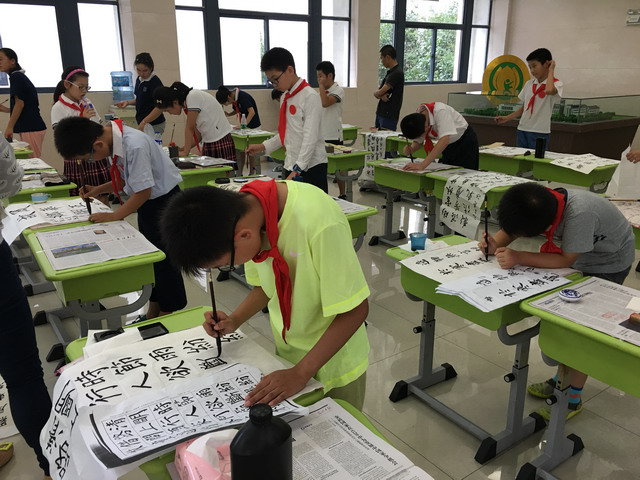 启动仪式前四位平直学子在方蓓老师的指导下,当场为大家书写并展示了自己的书法作品。“春风把大地吹醒,春雨让土地滋润,山坡下的种植园里,开始翻土,准备春播育苗......”会场上传来了优美的朗诵声,这是二十多个平直实验小学五年级的学生在沈徐苗老师的带领下在台上诵读诗歌《银杏》。他们的表演精神饱满,声音委婉动听,动作优美自然,展现了银杏的康健俊秀,淡雅脱俗,孩子们的声声吟诵中流露出的是银杏古雅玲珑的冠叶,它那历久弥新的古韵,它那灿烂如阳的微笑,不由让人遐想无限,