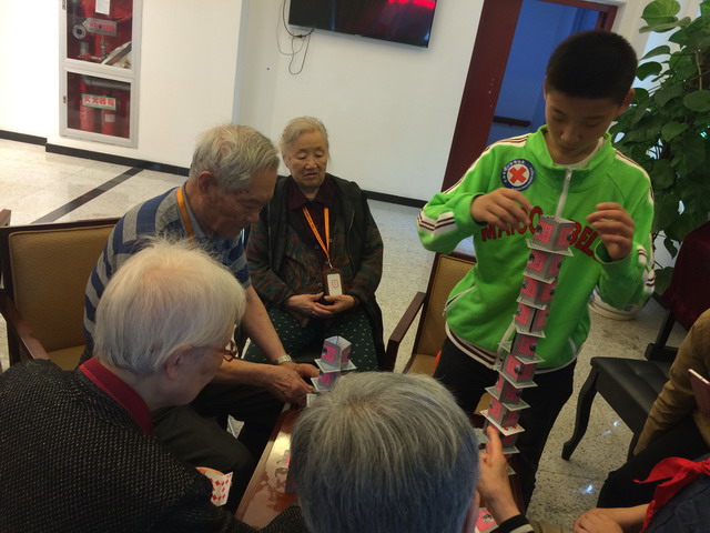 一张一张纸牌越叠越高,小小的纸牌“金字塔”孕育而生。“1、2、3、……20”,纸杯“金字塔”由20个纸杯组成,纹丝不动地立在桌子上。老人们和平直娃们一起玩着游戏,吃着点心,畅聊着曾经属于他们的六一儿童节。和孩子们一起,他们忘记了年龄,忘记了孤独,看到活泼开朗的孩子们宛如看到了曾经的自己,顿觉充满活力和朝气,满满的幸福感。