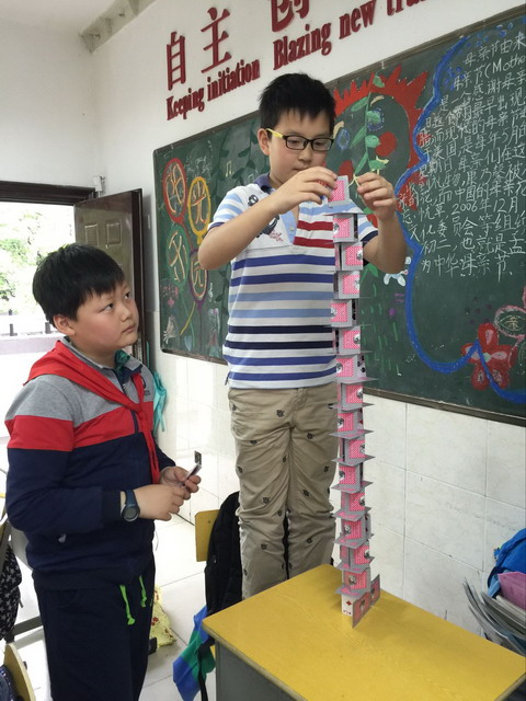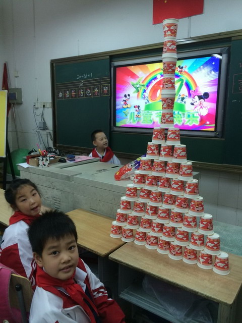 在丰富多彩的“六一”活动中,第二届校园科技吉尼斯叠叠高挑战赛尤其吸引学生的关注意。比赛分为低、中、高年级三个大组,低年级组是纸杯叠叠高比赛,中年级组是报纸叠叠高比赛,高年级组是纸牌叠叠高比赛。多种多样、充满趣味的比赛项目,点燃了同学们的热情。刷新上一届比赛的纪录成了每个孩子的奋斗目标。随着叠加高度的增高,孩子们个个都屏住呼吸,生怕呼出的气把“高塔”给吹到了。高度每增加一点,哪怕是一毫米,孩子们都会在心中暗自雀跃!