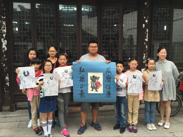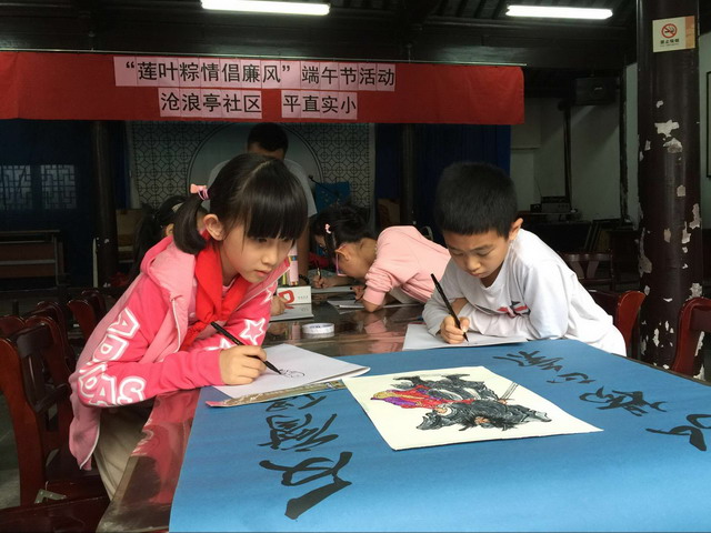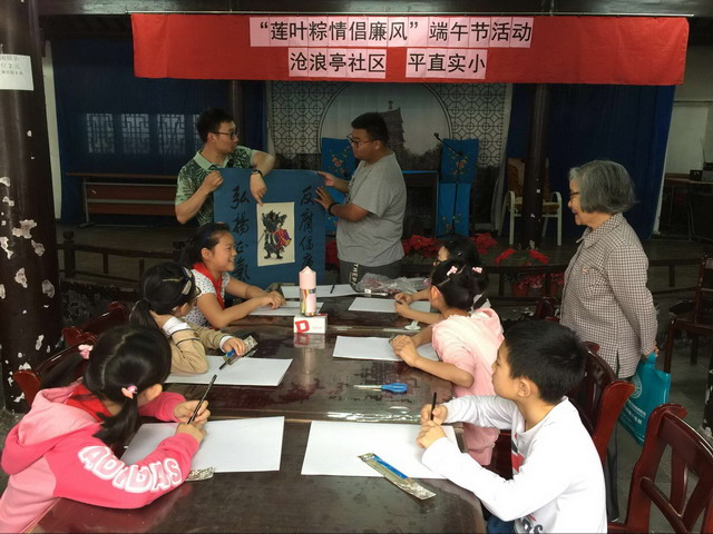在等待蒸荷叶粽的同时,平直的师生还在社区书画达人的指导下现场画钟馗,并把这些画作送给现场的老爷爷老奶奶,为他们带去端午节的吉祥祝福。