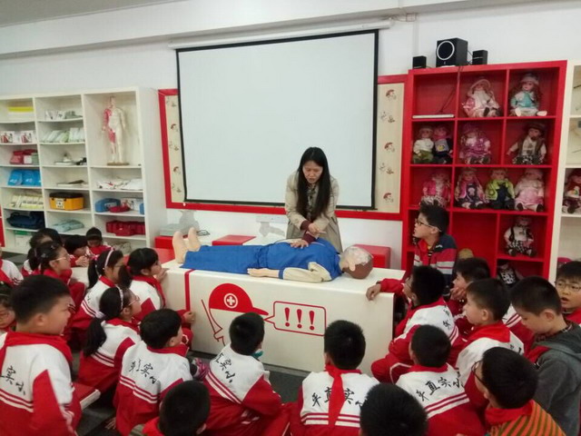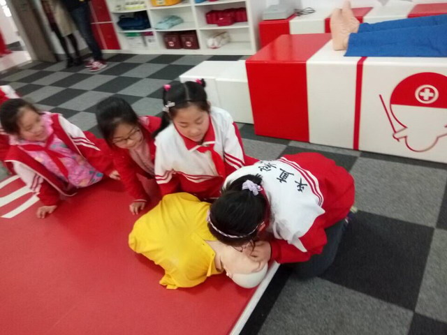 第一站,老师带我们走进了“急救室”。指导老师先给我们看了一段急救视频,告诉我们假如发现身边的人突然晕倒,我们该如何做。视频过后老师边讲解,