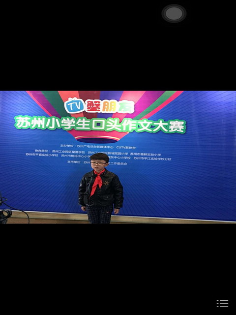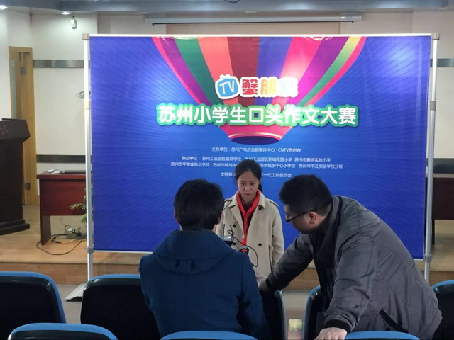 蓝色为主的TV背景,高高架起的摄像镜头,静静安坐的观众……平直实小报告厅里,学校89位同学正在参加“蟹朋柚首届小学生口头作文大赛”的现场录制。本次活动由苏州广电总台新媒体中心、CUTV苏州台主办,由平直实小等多所小学协办。