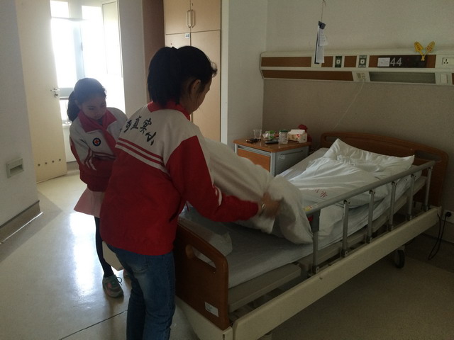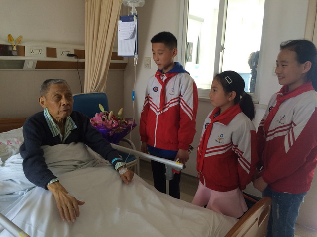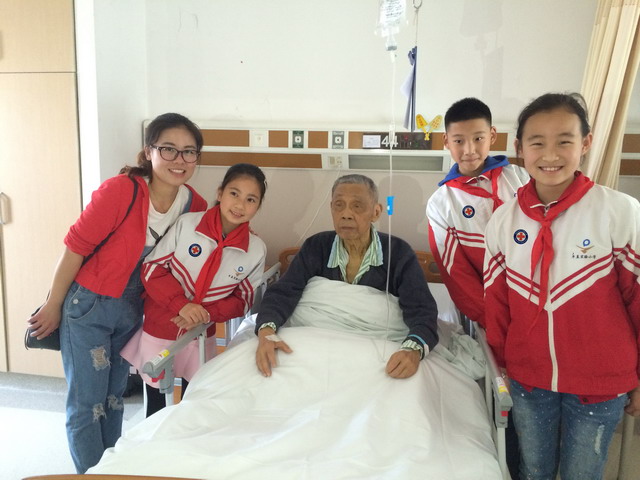 在爷爷的病房里,红十字会代表们陪他聊天、给他捶背、为他阅读最爱的《大江南北》。朱爷爷,曾参与过抗美援朝、解放战争,他的付出换来了现如今和平、幸福的生活。他时时刻刻关心着我校红十字会员们的成长,他的爱心牵挂着莘莘学子。作为省红十字会示范学校,“人道、博爱、奉献”的红会精神,深入每一个平直学子的心中,大家时刻不忘付出自己的爱心、施展自己的能力、不忘永远怀揣着一颗感恩的心。