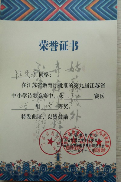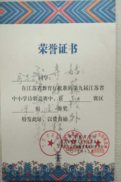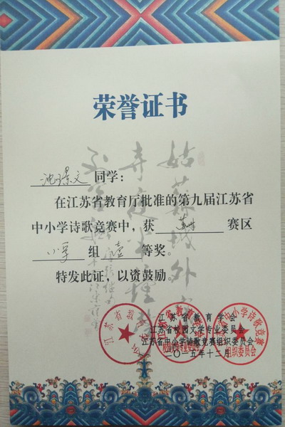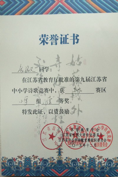为了让学生体会诗歌的艺术魅力,提高学生的诗歌创作水平,既孕育创新精神,又增强审美情趣,苏州市平直实验小学组织学生参与了江苏省第九届中小学诗歌竞赛,全校一共有317名学生报名参加了竞赛,共有96人获奖,其中一等奖16人,二等奖32人,三等奖48人。本次诗歌比赛,不仅弘扬了中国传统文化,而且突显了平直校园文化建设的内涵,同时也让同学们感受到了写诗歌的快乐!