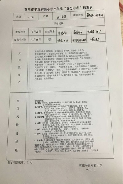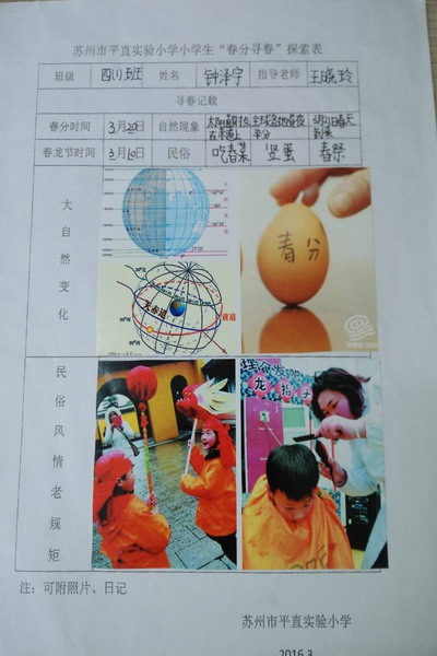梅花谢尽,樱花争艳;梨花清淡,木兰恬雅。花事正忙。大自然用生命的气息勾勒出一幅幽雅惊艳的图画。孩子们用稚嫩的眼睛透析出一个个美好蓬勃的时节。民俗风情,苏式规矩,娓娓道来。春分立蛋,人心舒畅;春龙剃头,福星高照;春祭献礼,敬祖承业。一张张“春分寻春”探索表,透着浓浓春意,露着苏式风情。孩子们通过踏青、上网查询、寻访等方法完成了探索表的填写,在活动中全校有近百名同学获得了“春分节气小使者”称号。