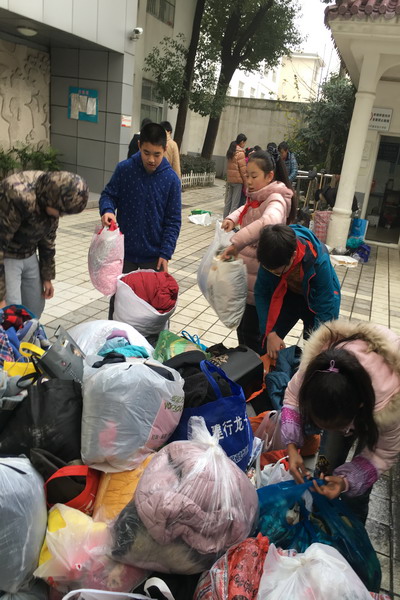 12月25日一大早,校门口就迎来了前来帮忙的义工爸爸妈妈们,中高年级的少先队干部们也早早忙活开了。每个进校门的同学手上都是大包小包,拎得满满当当。爷爷奶奶们也没闲着,这边奶奶一手一袋,细心叮咛“这些衣服我都洗干净了烫好了,都是好好的”;那边爷爷看着眼前的情景热情的询问“明天还能捐吗?我们家里还有,我现在回家拿来得及吗?”……冬日的早晨,柔和的光线,透过凝结的晨露,洒在平直的校园里,温暖了一片。