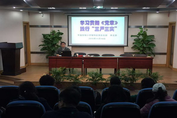2015年11月16日下午,平直辅导区全体党员教师集中平直实验小学报告厅开展组织生活。辅导区党总支书记季文学以《学习贯彻党章 践行“三严三实”》为题,为全体党员上了一堂专题党课。