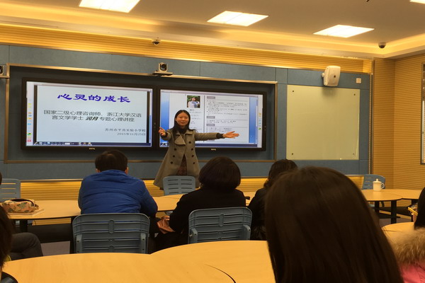 11月25日上午,未来教室热闹了起来,我校年轻老师们陆续坐定下来。原来是徐校长请来了一位特殊的朋友—— 国家二级心理咨询师、浙江大学汉语言文学学士润月老师。