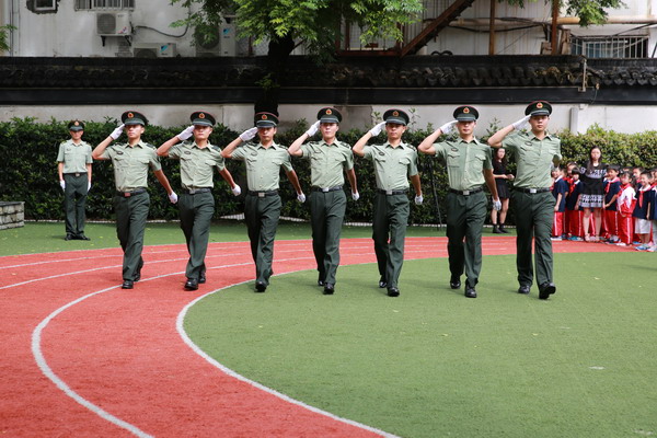 伴随着雄壮豪迈的国歌声,鲜艳的五星红旗徐徐升起。全体师生佩戴红领巾神情严肃,用最庄重的注目礼向冉冉升起的国旗致敬。仪式上,来自100医院部队的解放军们,给学生们带来了精彩的班队列演示。解放军整齐的动作,清脆响亮的口号声,让孩子们在感受他们严明纪律的同时,更多了一份对军人的崇敬与对社会的责任意识。接着孩子们也一显身手,精神百倍,雄赳赳、气昂昂地开展学做解放军的练习:立正、稍息、向前看齐等一个个动作学得像模像样,俨然就是一个个神气的小兵。活动中,来自部队的战士代表,给学生们讲述了新中国成立的故事,他简短回顾了中华民族的波澜曲折的历史进程,热情歌颂新中国成立66年来取得的巨大功绩,倡导全校师生弘扬中华民族精神,激发爱国、爱家、爱校的情感和振兴祖国的责任感。