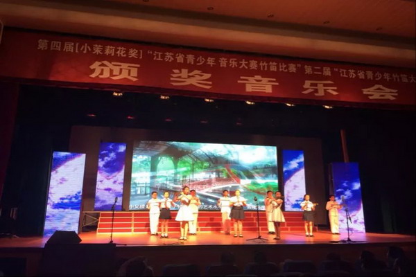 2015.8.25,从丹阳传来喜讯,我校选送的由11名同学组成的笛乐团表演的竹笛重奏《红领巾之梦》喜获由江苏省音乐家协会、丹阳市委宣传部、丹阳市文学艺术联合会、 丹阳市教育局主办,江苏省竹笛学会、丹阳市音乐家协会、丹阳市新区实验小学承办的第三届【小茉莉花奖】“江苏省青少年音乐大赛竹笛比赛”;第二届“江苏省青少年竹笛大赛”组合组金奖。另我校笛乐团还参加了8.26日晚举行的颁奖音乐会表演,获得了观众的一致好评。中国竹笛专业委员会常务理事,中央电视台“十大”青年笛子演奏王溪,江苏省音乐家协会副主席,秘书长吴盛栗,中共丹阳市委宣传部,市政府,市教育局等主要领导出席了26日晚的颁奖音乐会。