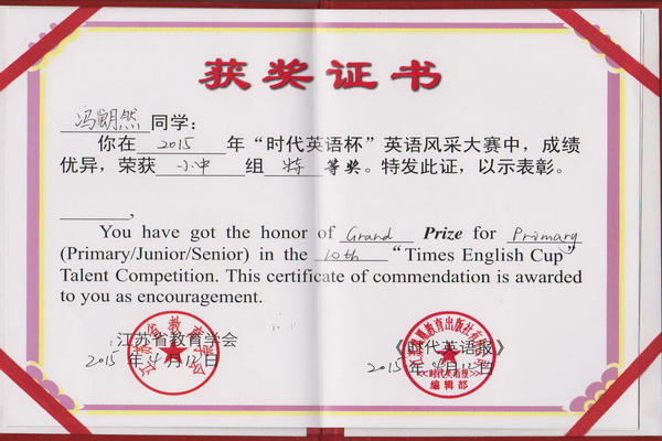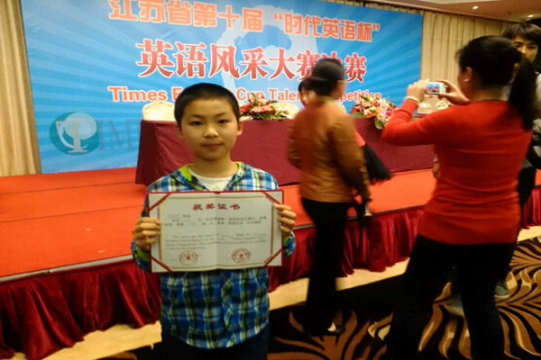 ,由江苏省教育学会和江苏凤凰教育出版社时代英语报社共同主办的江苏省第十届“时代英语杯”英语风采大赛总决赛在南京举行。我凭借优秀的英语能力有幸成为苏州市区代表选手之一参加了此次决赛,并获得特等奖。