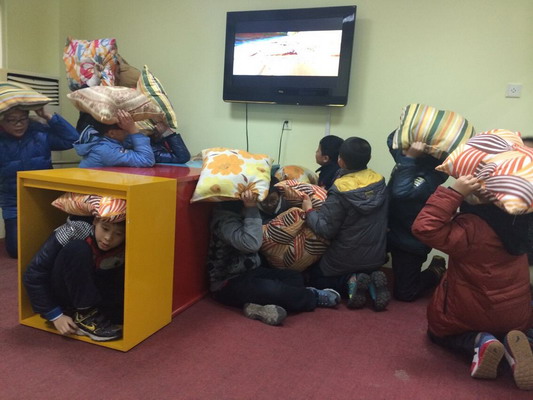 最后队员们走进了地震体验馆。一段真实的视频带着我们走进了可怕的地震。通过模拟器,我们深深的感受到地震来临时有多无助。猛烈的晃动,使大家只能紧紧地搂住栏杆。可是当真正的地震来临时,并不仅仅是抓着栏杆就能安全的。我们学习了简单的地震应急避让措施,队员们都很认真的完成。