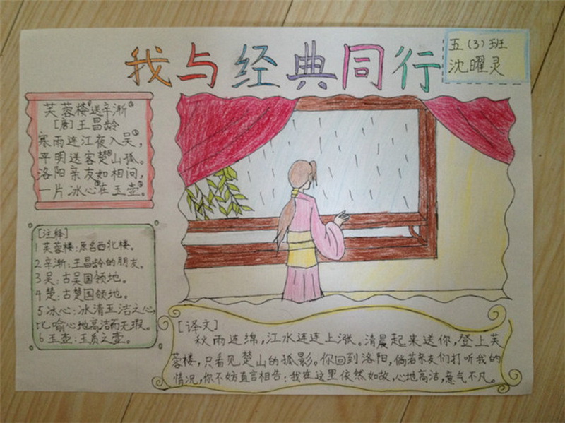 低年级画经典——把品味到的经典诗文中的韵味,用绘画的方式表现出来;中、高年级品经典——了解诗文的背景资料,进行诗文赏析,用手抄报的形式展现自己的诵读成果和诵读感悟。