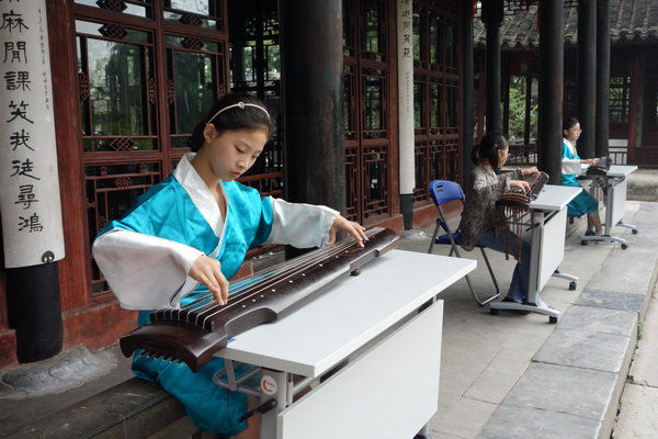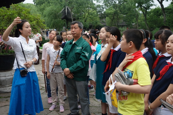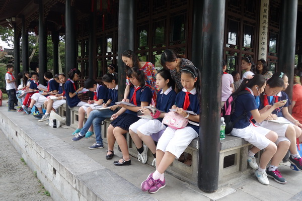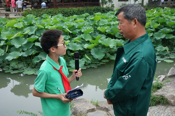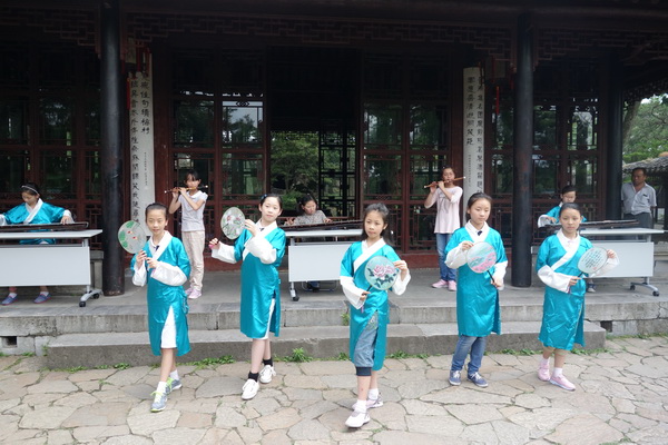 活动中,苏州市教科院课题专家、苏州市综合实践活动课程教研员徐燕萍也亲临现场,指导实践活动。师生们分组完成任务,聆听园林专家的介绍,了解拙政园的古建概貌和保护古建事迹;从不同角度展开调查、落实实践。在雅致的古琴声和悠扬的笛声中,孩子们手执亲笔绘制的绢宫扇翩翩起舞,融拙政园恬静、优雅、古朴的气质,在中外游客面前一一展现。与此同时,调查组和小记者组的孩子们正在用自己设计的“古建筑调查表”和“古建筑采访表”,对园林专家和中外游客进行调查访问,调查其对拙政园古建筑的了解,调查他们对古建筑保护的观点;摄影组的同学们则用他们的镜头记录着园里的一景一物,沧海桑田,留下的是文化的痕迹;在这一行人中,最辛苦的要数文学组的同学了,只见他们在各个小组中穿行着,不时的用手中的笔记录下同学、游人的一举一动,将拙政园的古典静谧之美和历史文化底蕴用行云流水般的文字展现在我们的眼前……