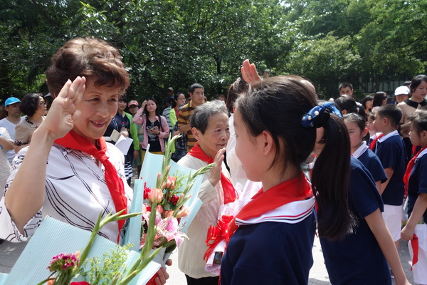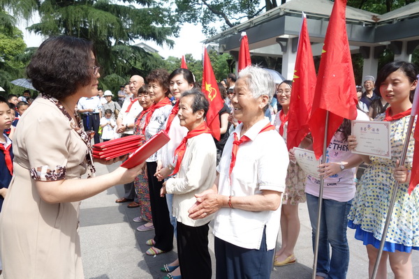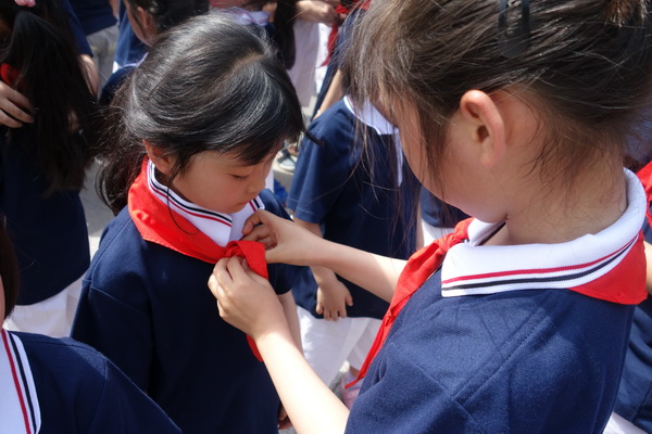 下午二点,在苏州大公园内,平直实验小学开展了别样的入队仪式。庄严的国旗下,我校四年级的队干部们为本次活动的特别嘉宾——六位苏州市劳模戴上了红领巾。这六位劳模在不同的行业勤勤恳恳、兢兢业业,为社会的进步贡献着自己的一份力量!