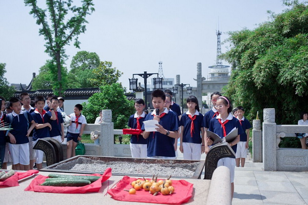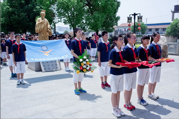 下午,伴随着庄严的音乐声,平直的师生们来到伍子胥的墓碑前,敬献花篮、供品、敬献三杯酒。深深地三鞠躬,表达了学子们对这位苏城开拓者的无限敬仰之情。