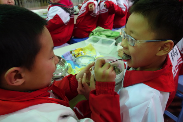 中午,一股清甜的香味弥漫在平直的校园中,每一个孩子们脸上都藏不住那份期待。教室门口的盛饭处那满满当当的一桶桶腊八粥正飘着热气,排着队盛粥的孩子们按捺不住激动之情,纷纷探着头张望——“还有几个才轮到我呀?”“快啦快啦!快到我了!”那迫不及待的可爱摸样让老师们忍俊不禁。