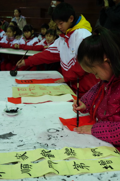 老师的带领下,学校书法社团的孩子们特别现场书写若干对联赠送给前来参加活动的爷爷奶奶。吃着甜甜蜜蜜的腊八粥,听着爷爷奶奶们回忆的过往故事,孩子们的脸上绽开了幸福的微笑,大伙心怀感恩,珍惜当下。
