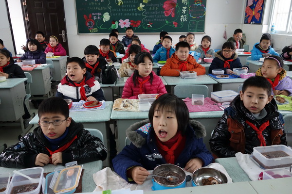 ,请用腊八粥。”孩子们齐声回答:“谢谢农民伯伯,谢谢父母,谢谢老师,谢谢同学,大家请用。”这简单的问答或许算不上是一个仪式,但却让孩子们在享用食物之前能够想一想它们的来之不易,想一想多少人在为自己的幸福做着贡献。平淡之中,感恩教育融入其内,但谁说小小的感恩不能化作大大的行动呢?