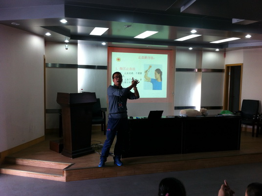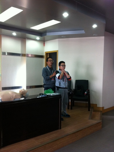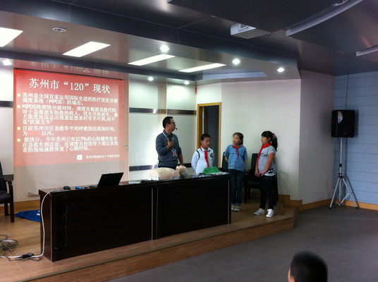 培训活动中,唐老师通过播放影视片段、多媒体课件,从如何判断气管异物堵塞入手,介绍了心肺复苏、创伤救护止血,如何拨打120急救电话,并现场演示了气管异物堵塞后的急救方法,以师生互动、现场问答的方式帮助学生掌握了急救的动作要领,学到了基本的救护技能,受到了学生的热烈欢迎。