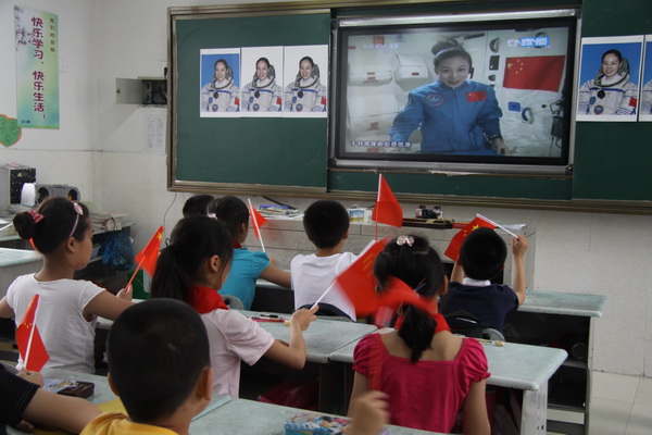 6月20日上午10时许,神舟十号的航天员在天宫一号这一“中国的最高讲台”开展太空环境下的科学实验,为全国青少年进行太空授课,平直实小也组织全校师生共同收看太空授课实况,以直观地认识失重环境下物体运动特性、液体表面张力特性等科学现象。
