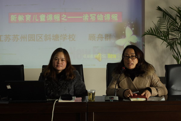 教育是唤醒,每一个生命都是一粒神奇的种子,蕴藏着不为人知的秘密。而阅读,则能唤醒这种蕴藏着的美好与神奇。为孩子们寻找一种适合他们的生活方式,为了给每一个童年播下一粒粒最美妙的种子,11月27日,应徐校长的盛情邀约,在苏州工业园区斜塘学校许芳副校长的陪同下,顾舟群老师为我校全体老师带来了丰富的精神大餐。活动中,小舟老师作了题为《童年最美丽的种子》的讲座。在台上,小舟老师娓娓讲述了自己的故事,故事中,她的博爱无私、勤奋努力以及自身文学底蕴的累积过程令老师们敬佩不已;她自06年至今为所教班级的孩子们而开设的十个读写绘专帖令老师们震撼不已。其后,小舟老师带领大家走进晨诵、绘本、整本书阅读的美丽世界,向老师们详细介绍了晨诵与绘本教学的具体操作步骤,并分享了自己在实践过程中的经验。顾老师以《小白马》、《温情的狮子》等经典绘本为例,展示了故事内容、课堂实录、致家长的信以及孩子们的作品与家长的回信和亲子阅读日记。顾老师还以晨诵《白云做游戏》的课件为例介绍了晨诵的选材及步骤。一幅幅让人惊叹的学生作品,一段段生动感人的成长故事以及精心设计的儿童课程,让每一个老师深刻地感受到了儿童课程的魅力。