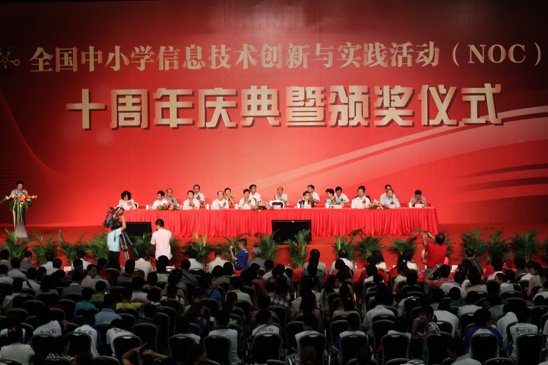 2012年7月30日晚,“全国中小学信息技术创新与实践活动”(简称NOC活动)十周年庆典暨颁奖仪式在国家会议中心隆重举行。第十届全国人大常委会副委员长、中国关心下一代工作委员会主任顾秀莲,中国发明协会理事长、科技部原部长朱丽兰,教育部副部长杜占元,教育部关心下一代工作委员会主任、中纪委驻教育部纪检组原组长田淑兰,中国发明协会常务副理事长、中纪委驻国家知识产权局纪检组原组长邢胜才,教育部师范教育司司长许涛,教育部基础教育二司副司长刘昌亚,教育部科学技术司副司长雷朝滋,中央电化教育馆馆长王珠珠,中国教育报刊社副社长兼中国教师报总编辑雷振海,国家科学技术奖励工作办公室社会奖励处处长陈苏等领导同志出席活动。来自全国各省市包括台北、澳门在内的31支代表队的近3000名师生参加现场活动。