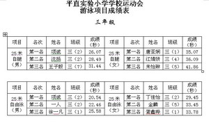 6月13-14日我校运动会隆重举行。比赛项目按年级设定。一、六年级为田径比赛,项目有30米、立定跳远、50米接力跑 、垒球。二~四年级为游泳比赛,项目有闷水PK赛、25米自由泳打腿、50米自由泳打腿、25米自由泳、50米自由泳。各班学生都踊跃报名积极参加各项比赛。比赛当天,学生都来为各自班级的参赛选手呐喊助威,场面十分热烈。裁判由体育教研组的老师担任,比赛秩序井井有条。特别是游泳比赛,在体育馆游泳中心展开激烈角逐,上演了一场精彩的水中竞技秀。在泳道中,选手们个个如鱼似箭般在水中穿梭,展现出选手们矫捷的身姿和精湛的技术。展示出平小的游泳健儿们不畏风浪,勇于进取的体育精神。看泳池里,比赛激烈;泳池边,拉拉队助威声一浪高过一浪。通过本次游泳比赛,旨在让学生热爱游泳运动,爱上游泳课,积极参加游泳锻炼,掌握一定的游泳技能,拥有健康的体魄,具有一定的安全、自我保护意识。养成良好的心理品质,形成健康的生活方式。