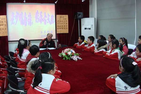 来教授学生们唱唐诗的是一位已经年过七旬的老人——王敬义老先生,他从二十年前开始学唱唐诗,至今已能用唱的形式将60首唐诗,用3、4种不同的曲调予以吟唱。在教唱唐诗之前,王老先生先为学生们讲述了诗的产生以及唐诗的不同形式和内容。而后以孟浩然的《春晓》和王维的《杂诗》两首唐诗为例,用两种不同的曲调,一句一句带领学生进行吟唱。虽然没有乐器的伴奏,但曲调本身的抑扬顿挫和婉转优美,依然带给在场跟学的同学们不小的惊喜。同学们很快能跟着一句句唱,和谐的童声更加衬托出了诗的音乐美。王老先生又以合唱、分组唱、个人唱的形式帮助孩子们一遍遍温习。孩子们出色的表现让老人感叹中华文化的传承后继有人,自己倍感高兴和欣慰。参加此次活动的学生也非常庆幸能有这次机会接触到唱唐诗这种形式。原来诵读唐诗也可以是一种乐趣,一种享受,自己对唐诗乃至中华古文化有了更浓厚的兴趣。