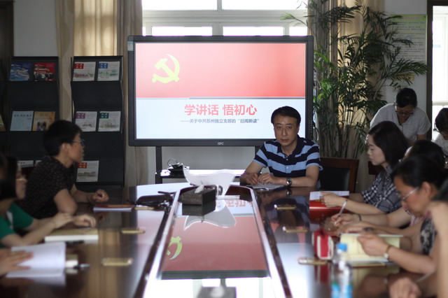 为深入学习贯彻落实党的十九大精神和习近平新时代中国特色社会主义思想,激励广大党员在新时代、新接力中展现新作为、做出新贡献。2018年6月13日下午,苏州市平直实验小学党支部书记董晨为全体党员讲授“学讲话 悟初心——关于中共苏州独立支部的旧闻新读”专题党课。