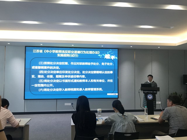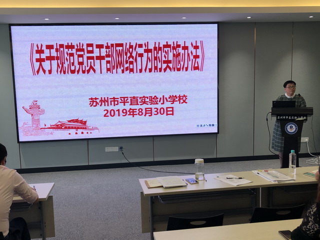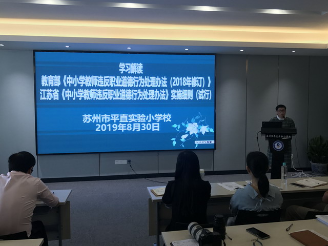 新学期伊始,为扎实推进学校师德师风建设工作常态化、长效化,根据区教体文旅委统一部署,2019年8月30日上午,苏州市平直实验小学校特开展新学期师德师风培训活动,组织全体教职工认真学习了教育部《中小学教师违反职业道德行为处理办法(2018年修订)》、江苏省《中小学教师违反职业道德行为处理办法》实施细则(试行)以及《关于规范党员干部网络行为的实施办法》三个文件。此次培训活动由辅导区党总支书记季文学主持。