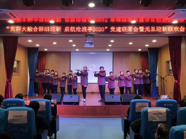 2019年12月27日下午,由双塔街道沧浪亭社区党委主办的“党群大融合辞旧迎新 启航沧浪亭2020”党建联席会暨元旦迎新联欢会在苏州市工人文化宫隆重举行。苏州市平直实验小学校作为辖区内的共建单位,20名师生代表参加了此次活动,并上台表演了笛子合奏《我和我的祖国》。小笛手们的精彩演出获得了在场观众的热烈掌声。